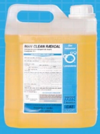MAN CLEAN RADICAL é um detergente para lavagem de roupas brancas ou coloridas, de fibras naturais ou sintéticas com